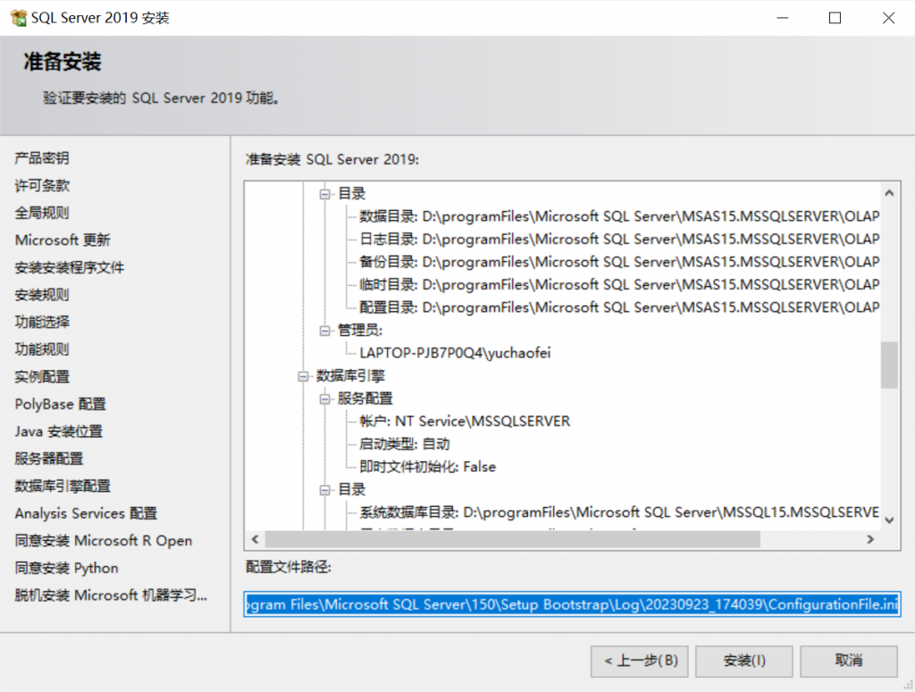 配置文件路径: C:\Program Files\Microsoft SQL Server\150\Setup Bootstrap\Log\20230923_174039\ConfigurationFile.ini