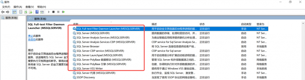 安装好之后SQL Server实例就自动启动处于运行中了,可以从【服务】中看到当前状态